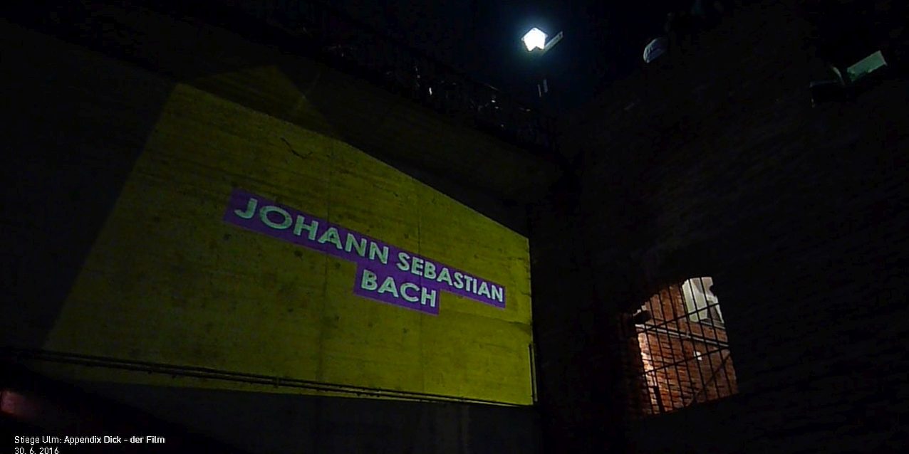 30. 6. 2016. Ein Mann klemmt in einem Fenster, fünf Meter über der Erde. Es ist Kurator Martin Leibinger, der die Projektion für „Appendix Dick – der Film“ einrichtet. Die „Stiege Ulm“ ist im dritten Jahr ein Ort für Kultur und Begegnung, nebenbei die spannendste Open Air Bar weit und breit. Auf einen maroden Brückenkopf projiziert feierten an diesem Abend neben Konrad Adenauer und Johann Sebastian Bach auch Bix Beiderbecke, Louis Armstrong und ein paar Bösewichte der Menschheitsgeschichte ihr erstes Erscheinen in Ulm. „Appendix Dick – der Film“ dauerte 92 Minuten und trotz instabiler Wetterlage waren viele gekommen, um Autor Tommi Brem sowie sein Buch- und Filmprojekt kennen zu lernen.