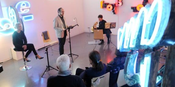 Ein schöner Abend im faszinierenden Ambiente der Neu-Ulmer Kunstgalerie „Venet Haus Galerie“. Zwischen den leuchtenden Buchstaben von Benjamin Schubert erweckten das Trio Teatrino und Hornist Adriano Orlandi das Schmunzelvergnügen „Molto Giocoso“ zum Leben.