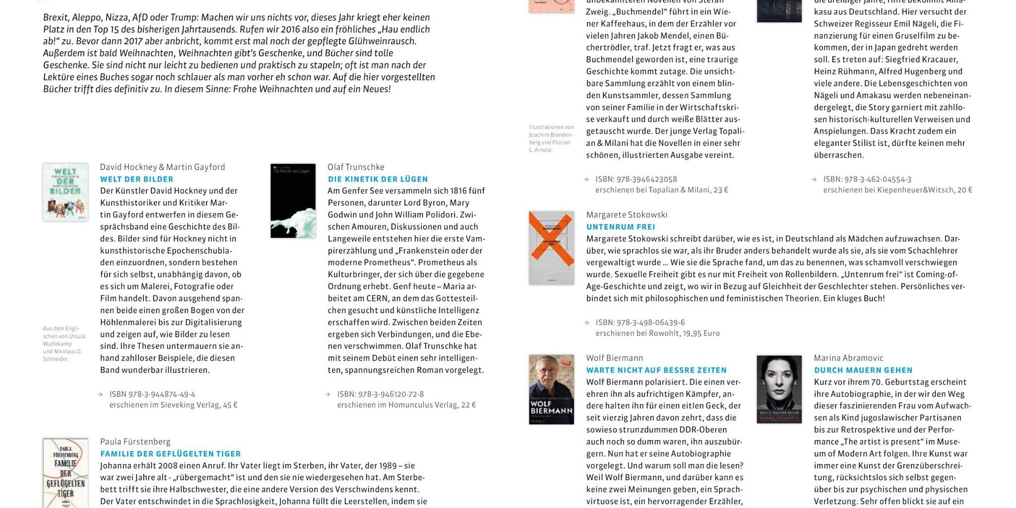 Bis zum Februar werdet ihr keine schönere Bücherseite (genauer: Doppelseite) mehr zu Gesicht bekommen. Nicht im LEO – Das Anhalt Magazin, und vermutlich auch nicht anderswo. Mit Titeln aus dem Ullstein Verlag, von Topalian & Milani Verlag, Sieveking Verlag, Verlag Kiepenheuer & Witsch und homunculus verlag!