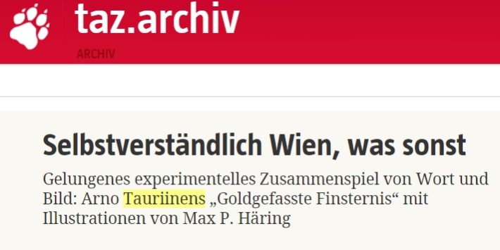 „Gelungenes experimentelles Zusammenspiel von Wort und Bild: Arno Tauriinens „Goldgefasste Finsternis“ mit Illustrationen von Max P. Häring“ urteilt die TAZ in ihrer aktuellen Rezension von „Goldgefasste Finsternis“. Wir freuen uns sehr, daß in dieser Besprechung auch die grafische Ausstattung und insbesondere die intensive zeichnerische Arbeit von >> Max P. Häring gewürdigt werden: