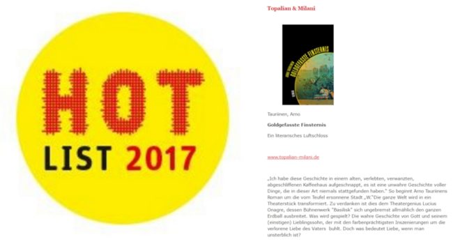 Hotlist 2017! Die Wahl hat begonnen! 184 Verlage haben für die diesjährige Hotlist einen Titel eingereicht. Das Kuratorium hat 30 Kandidaten daraus bestimmt, die jetzt bei der diesjährigen Jury und bei allen, die unabhängige Bücher mögen, zur Wahl stehen. Wir freuen uns sehr, daß Arno Tauriinens „Goldgefasste Finsternis“ dabei ist. Und wagen es, aus dieser…